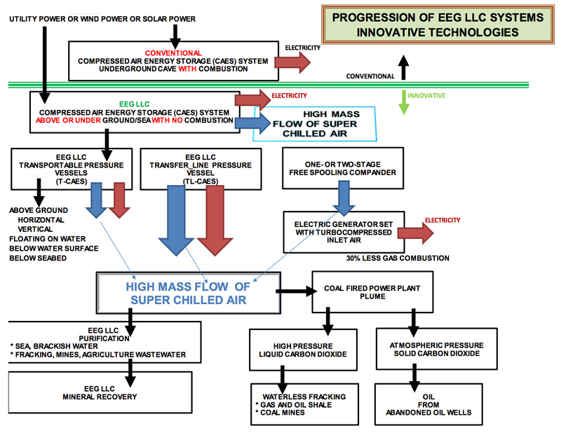 3. High mass flow of super-chilled air from two-stage turboexpander/generator set of the EEG LLC TL-CAES system for large-size flows of wastewater…as well as generating electricity from a green energy source (wind farms, solar photovoltaic panel farms, etc)